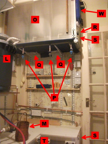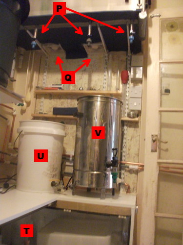 These are my two elderly boilers: a polypropene "Electrim" bin (U) and a venerable "Burco" boiler (V) that I've had since my university days (and it wasn't new even then!).