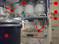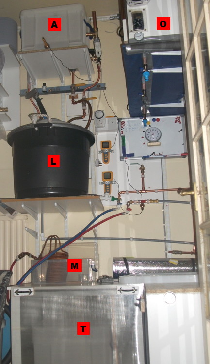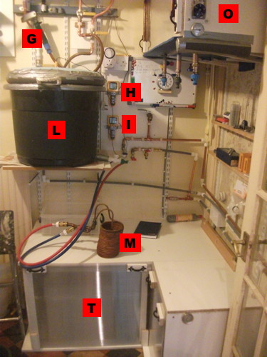This photo shows three barrels sitting in the insulated "cellar" cupboard (O) which is maintained