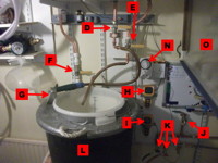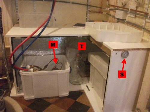 Then it flows down again to the bottom level, the fermentation cupboard (T), where the cooler (M) is dunked in it to reduce the temperature to about 25°C.