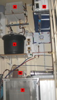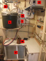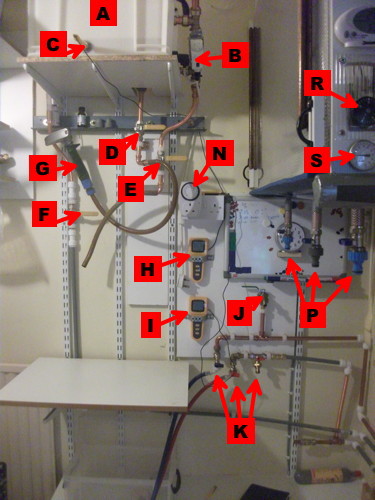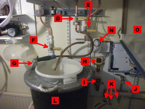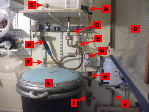 (as are the fermenters). To the right of the HLT (B) you can see the heater (cheapo kettle element)